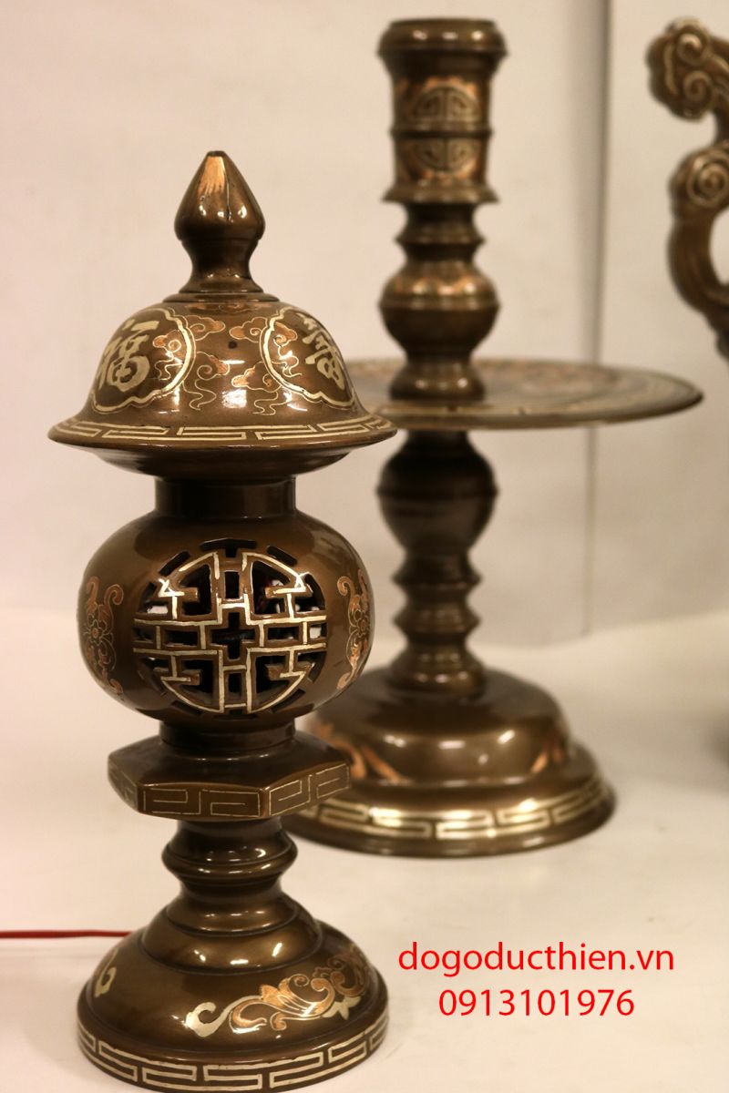 Kích thước: Lư hương cao 48cm + 2 chân nến cao 40cm + 2 đèn cao 31.5cm