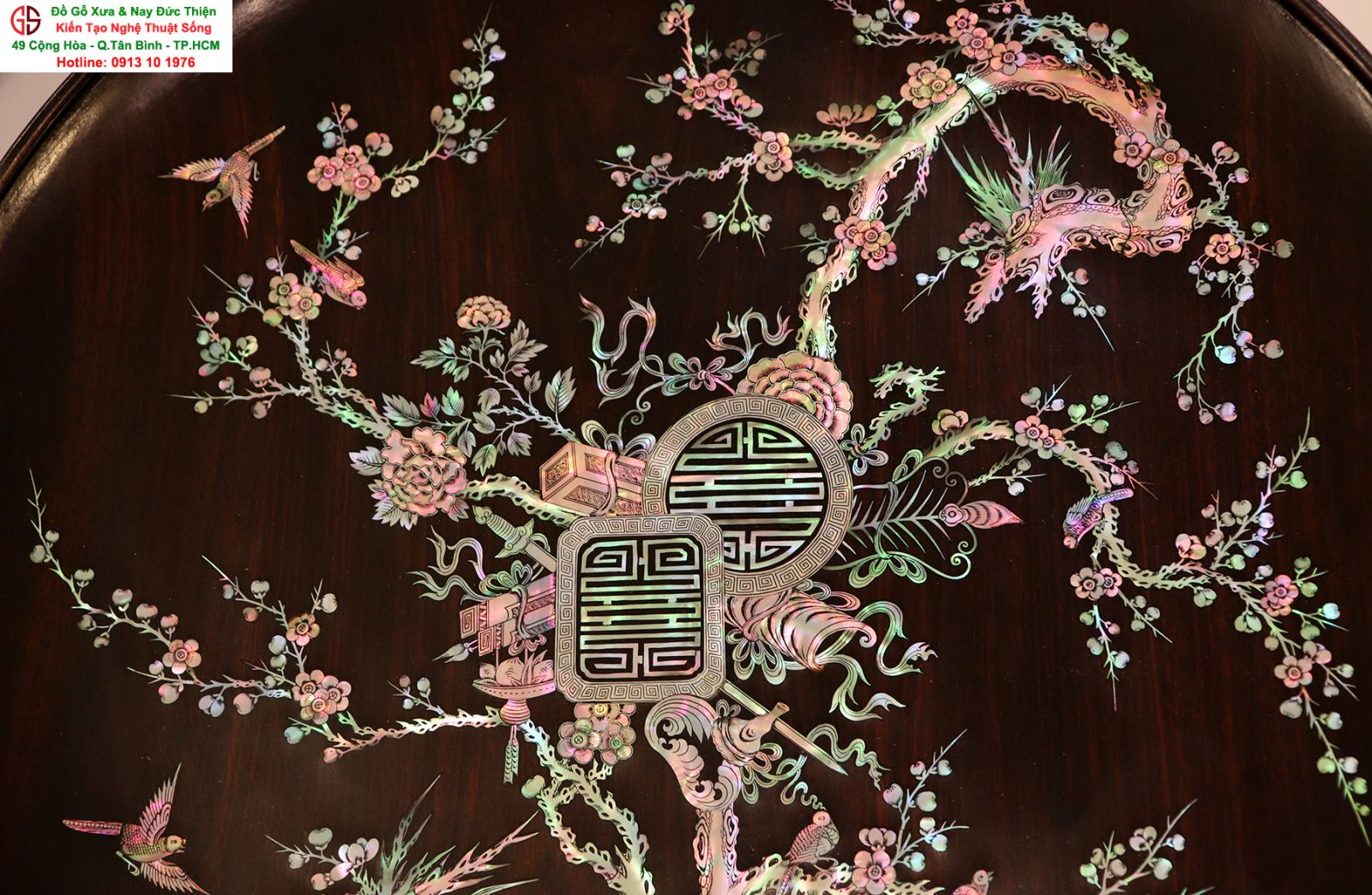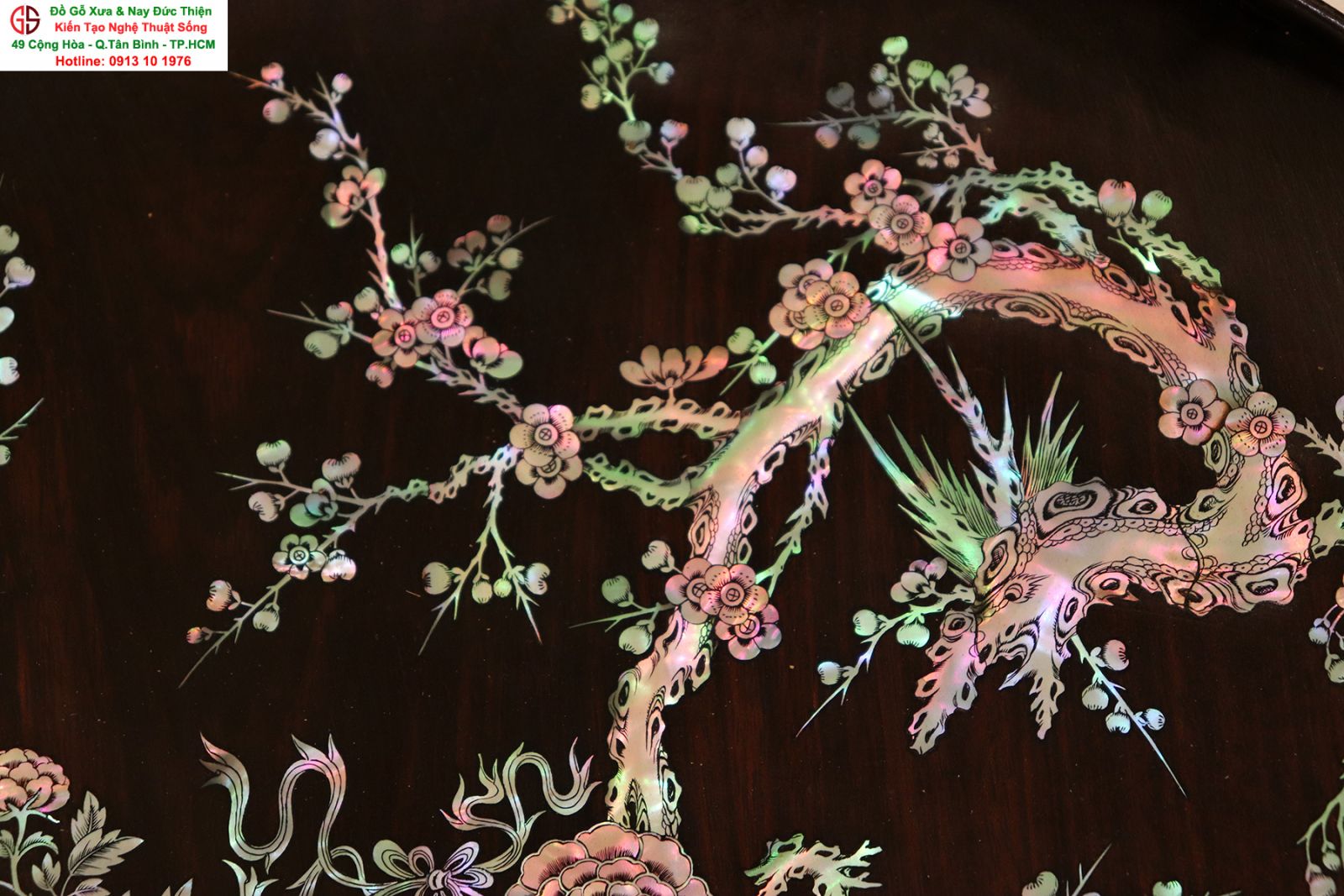 + Chất liệu: Đĩa được làm bằng gỗ gụ khảm ốc xà cừ cao cấp.