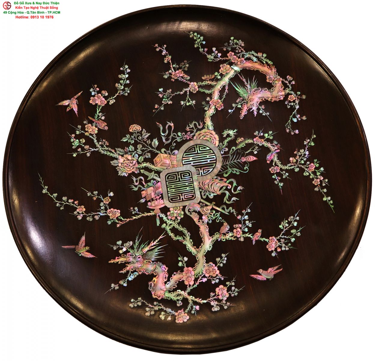 đĩa gỗ khảm ốc mai hóa rồng, mai cài chữ thọ đẹp là một trân phẩm rất đáng sưu tầm, có thể làm quà biếu sang trọng và ý nghĩa, để trưng bày cũng rất đẹp.
