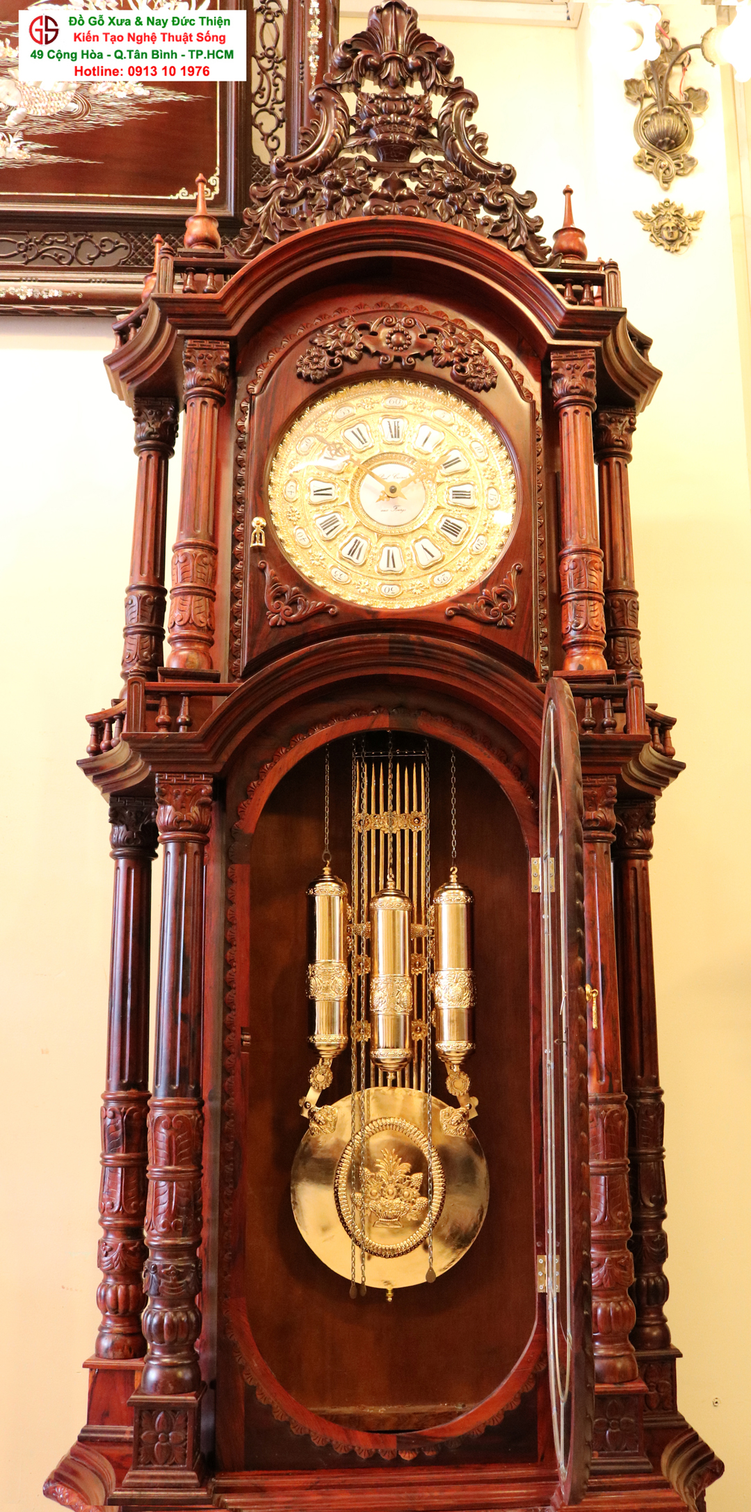 Với nhiều năm kinh nghiệm kinh doanh và sưu tầm những món đồ nội thất gỗ cao cấp, đồng hồ theo kiểu xưa, hôm nay, Đồ Gỗ Đức Thiện đã chọn lọc rất kỹ và xin gửi tới quý khách hàng một "siêu phẩm " hàng hiếm - Chiếc đồng hồ tủ loại VIP. Chiếc đồng hồ tủ loại lớn này là sự hội tụ những gì đẹp nhất, quý giá nhất, tinh túy nhất. Tủ đồng hồ được đóng hoàn toàn từ loại gỗ lõi của cây Cẩm Lai Việt ( Vân đẹp như vân gỗ Trắc ). Máy được sử dụng là dòng máy lớn được nhập khẩu từ Đức - chạy ổn định. Toàn bộ phần mặt đồng hồ, quả lắc, tạ đều được mạ vàng 24K, đẹp, sang trọng và đẳng cấp.