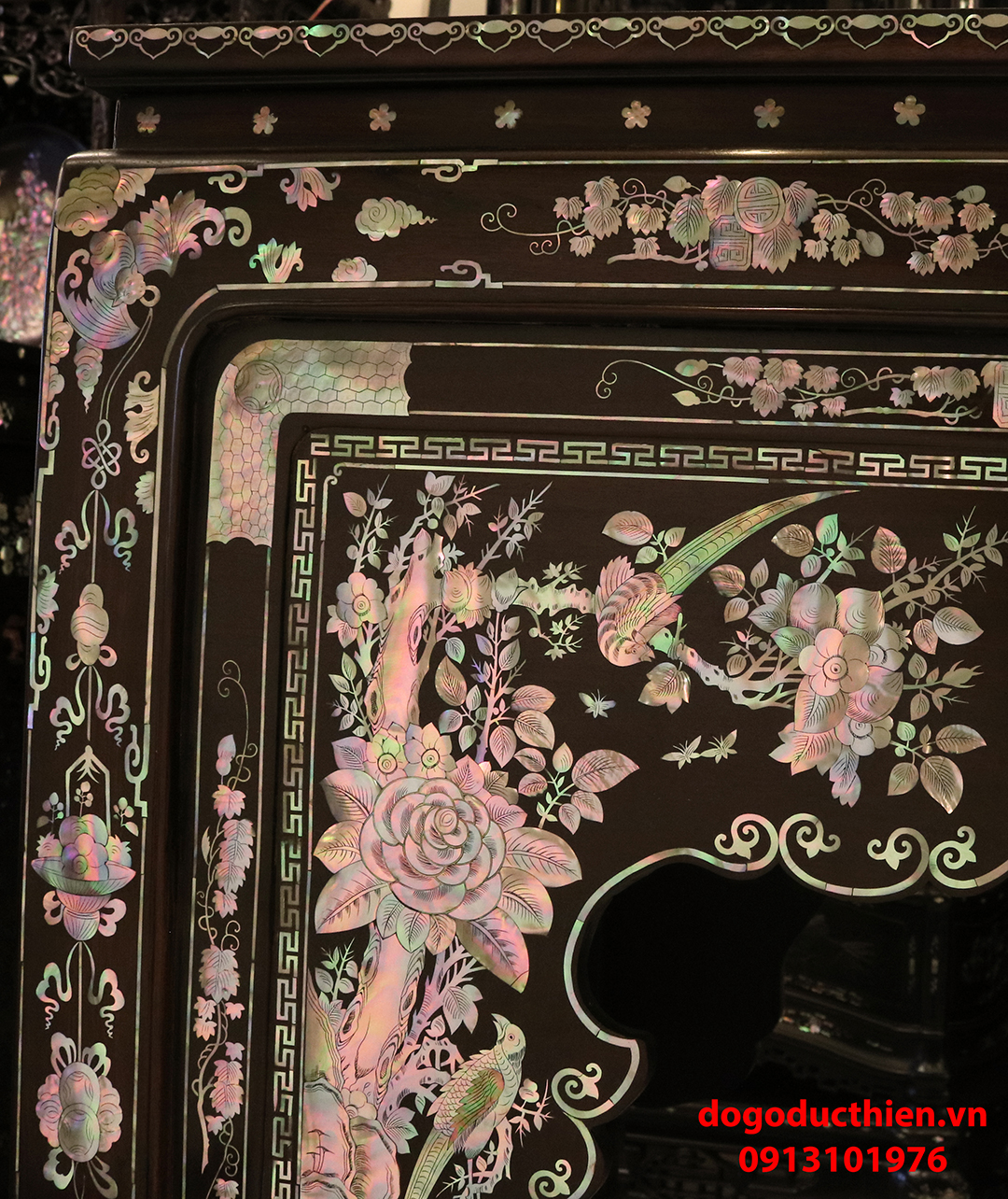 Và hôm nay, hữu duyên tôi lại được giới thiệu với các bạn, những người có chung niềm đam mê một chiếc bàn Nghi Thờ như thế. Không giống như những cái bàn thông thường mà các bạn đã thấy, chiếc bàn tôi giới thiệu dưới đây là một chiếc bàn Nghi Thờ loại Nhất.Thông thường các bạn chỉ thấy những chiếc ghế nghi thờ 50 - 1 mét hoặc 55cm x 1,1 mét nhưng chiếc bàn khảm này rộng tới 68 cm x ngang 128 cm là thuộc loại to hiếm thấy. Ngoài ra, nguyên liệu ốc sà cừ dùng để cẩn khảm cho chiếc bàn này cũng được lựa chọn khá kỹ, ốc đều đỏ, vàng chanh, xanh thiên lý đẹp rực rỡ 7 màu. Từng đường nét đều được cắt tỉa mềm mại, chăm chút và tỉ mỉ đạt tới độ tinh xảo thể hiện được cái tài hoa của người nghệ nhân thực thụ.