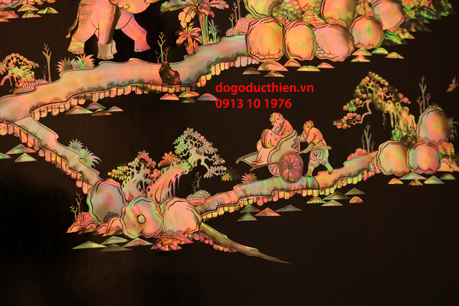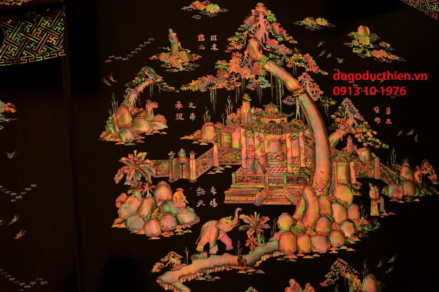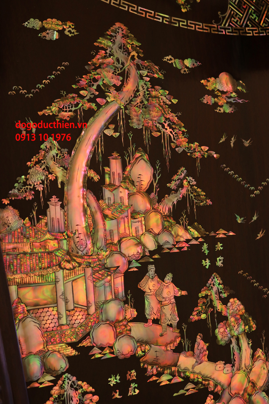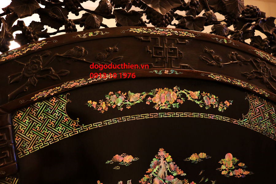 Ảnh chụp chi tiết sản phẩm: Tấm bình phong gồm 2 mặt : Mặt trước và mặt sau đều khảm ốc sà cừ.