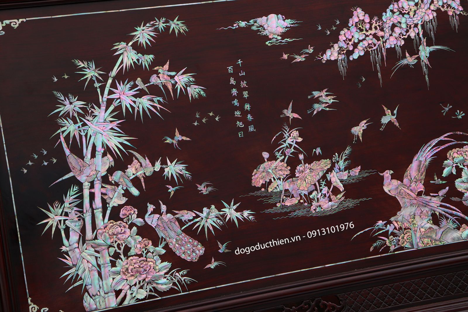 + Chất Liệu: Gỗ gụ, khảm ốc đỏ lửa vàng chanh.