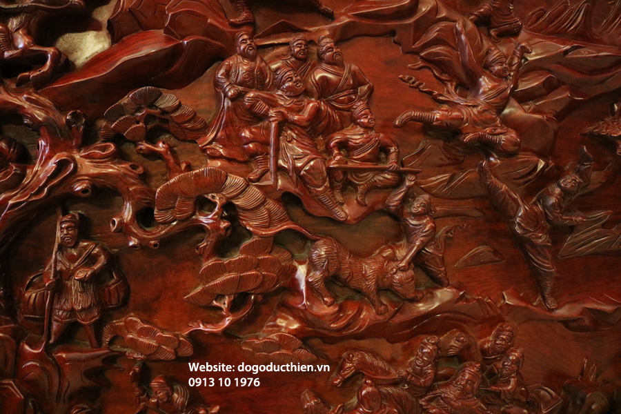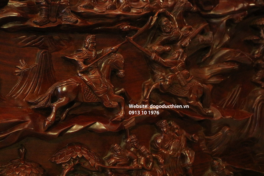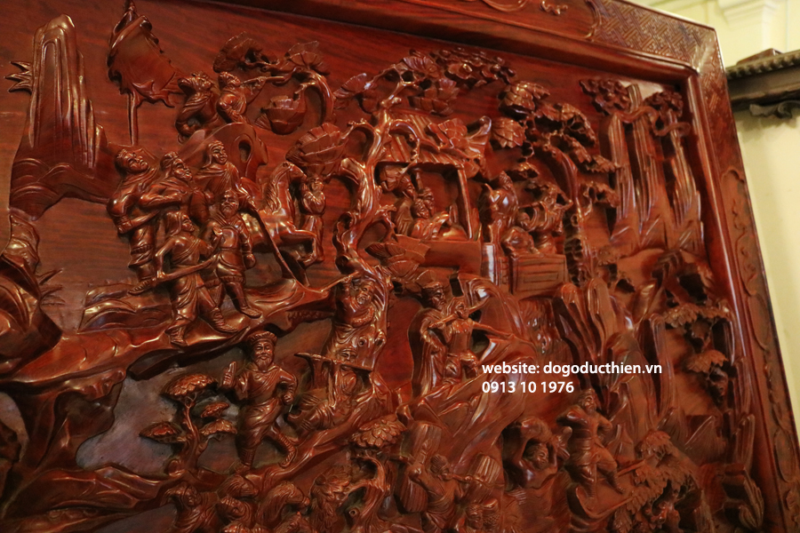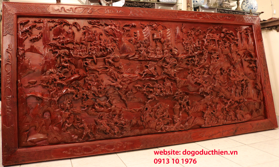 Bức tranh có chiều dài 289 cm x rộng 140 cm x dày 9 cm được làm từ Gỗ Hương Vân được chạm khắc cầu kỳ tinh xảo bởi bàn tay nghệ nhân Huế.
