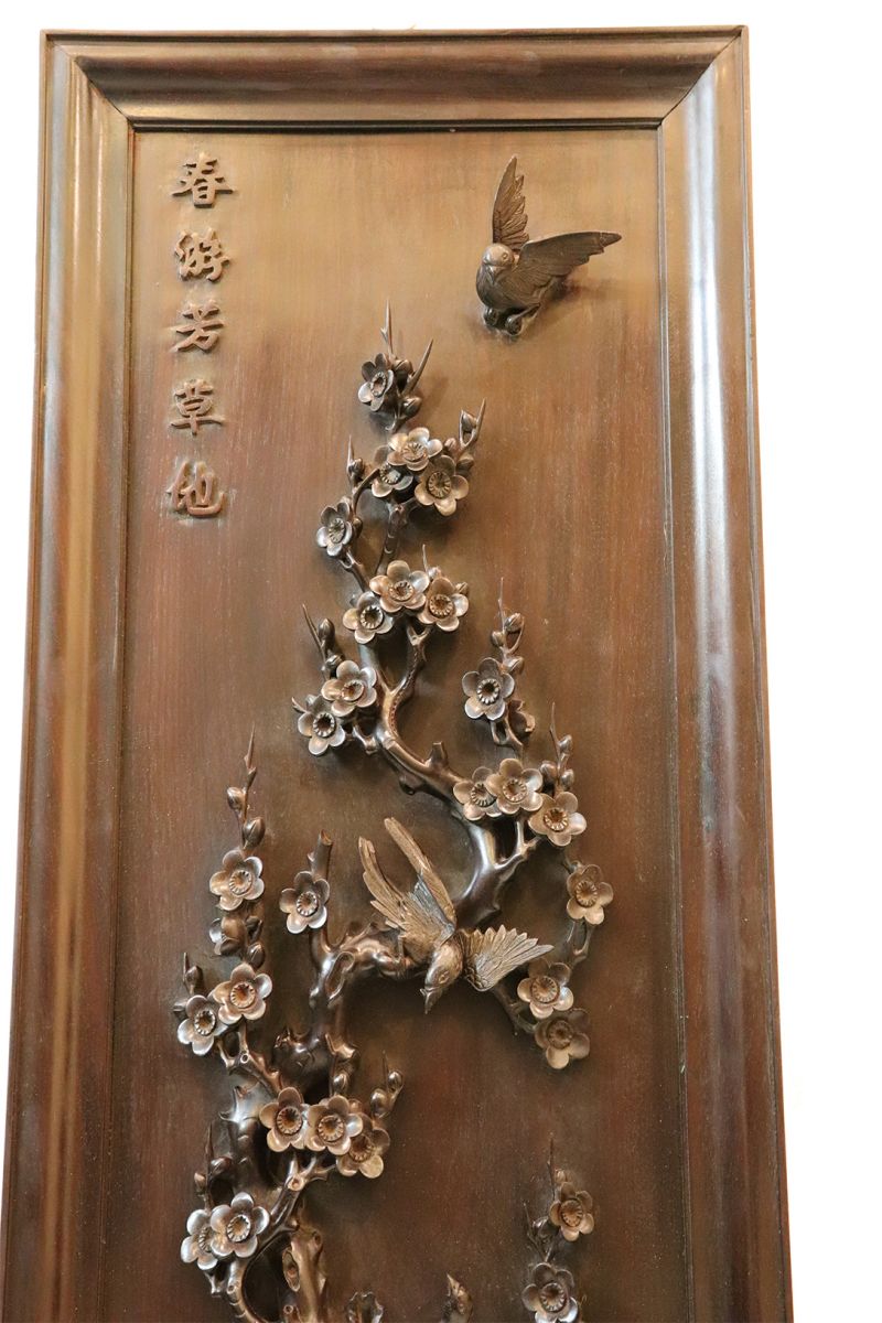 Đề tài được thể hiện ở bộ tranh này là tùng cúc trúc mai - bốn cây tượng trưng cho 4 mùa trong năm: Xuân Hạ Thu Đông. Điểm đặc biệt của bộ tranh này là tất cả gỗ được sử dụng đều là gỗ gụ nguyên tấm: Một tấm gỗ dày khoảng 5 cm được những người nghệ nhân lành nghề chạm khắc bằng nay nổi lên trên nền gỗ. Chính vì làm hoàn toàn bằng thủ công tay nên nét chạm khắc cực kỳ sinh động, không nét nào giống nét nào. Nó khắc hẳn với những tác phẩm chạm máy cứng nhắc và vô hồn.