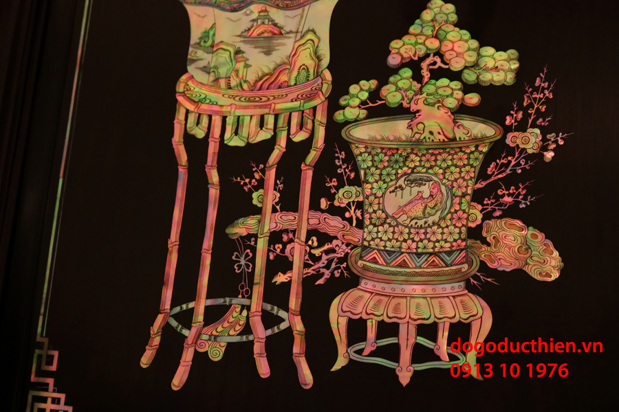 Chất liệu: gỗ trắc toàn bộ, khảm ốc đỏ lửa vàng chanh, xanh thiên lý.