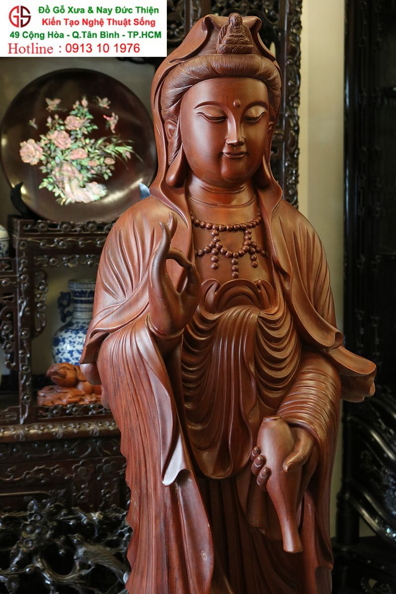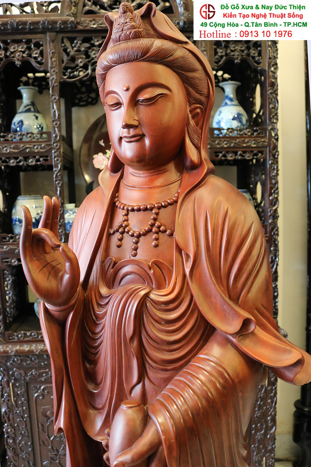 Tượng Phật Quan Âm được chế tác từ bàn tay tài hoa của người nghệ nhân trên chất liệu gỗ nguyên khối không chắp ghép, sẽ là một tuyệt phẩm không nên bỏ qua cho những ai có niềm đam mê tượng gỗ đẹp.
